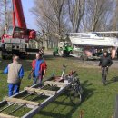 Auch dieses Mal verlief das Einkranen der Boote dank der guten Organisation wieder reibungslos und zügig. Da böse Menschen Manfred Gerstadts Kran vor kurzem erst abgefackelt hatten, wurde von ihm ein Kran aus Mainz geordert