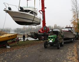 Dank der guten Organisation und den vielen kameradschaftlichen Helfern verlief wieder alles reibungslos und Manfred Gerstadt konnte von 0800 Uhr bis 1400 Uhr 36 Boote aus dem Wasser hieven und auf die Trailer stellen.